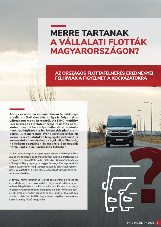 Az MHC Mobility 2025-ös Országos Flottafelmérése szerint a magyar vállalatok flottakezelési szokásai átalakulóban vannak, és egyre nagyobb szerepet kap az operatív lízing. A konstrukció népszerűsége 10%-kal nőtt az előző évhez képest, amit elsősorban a kiszámíthatóság és költséghatékonyság indokol. A cégek egyre később cserélik le saját tulajdonú autókat, amelyek átlagéletkora 6 évet jelent, ezzel növelve a fenntartási költségeket és az üzleti kockázatokat.