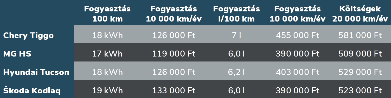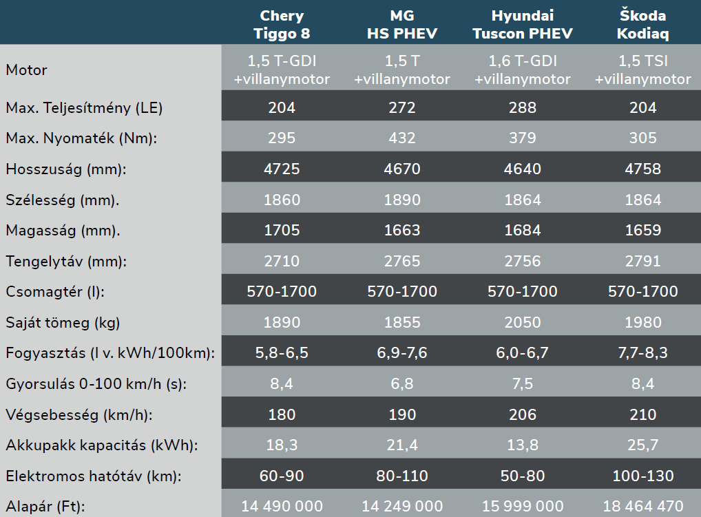 A plug-in hibrid SUV-k papíron szinte verhetetlenek, hiszen városban elektromos autóként viselkednek, hosszú úton pedig eltűnik a hatótáv para a belső égésű motornak köszönhetően. A valóság azonban – mint mindig – azért sokkal árnyaltabb. A most következő cikkünkben a négy tesztalanyunk a Chery Tiggo 8, az MG HS, a Hyundai Tucson és a Škoda Kodiaq összevetése jól megmutatja, hogy a méret, az ár és a használati profil legalább annyira számít, mint a névleges elektromos hatótáv.